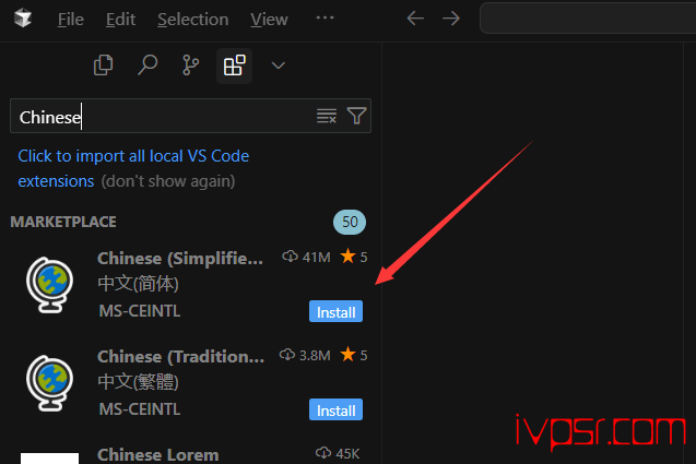 在搜索栏中输入【Chinese】,我这里选择的是中文简体 ,点击 install