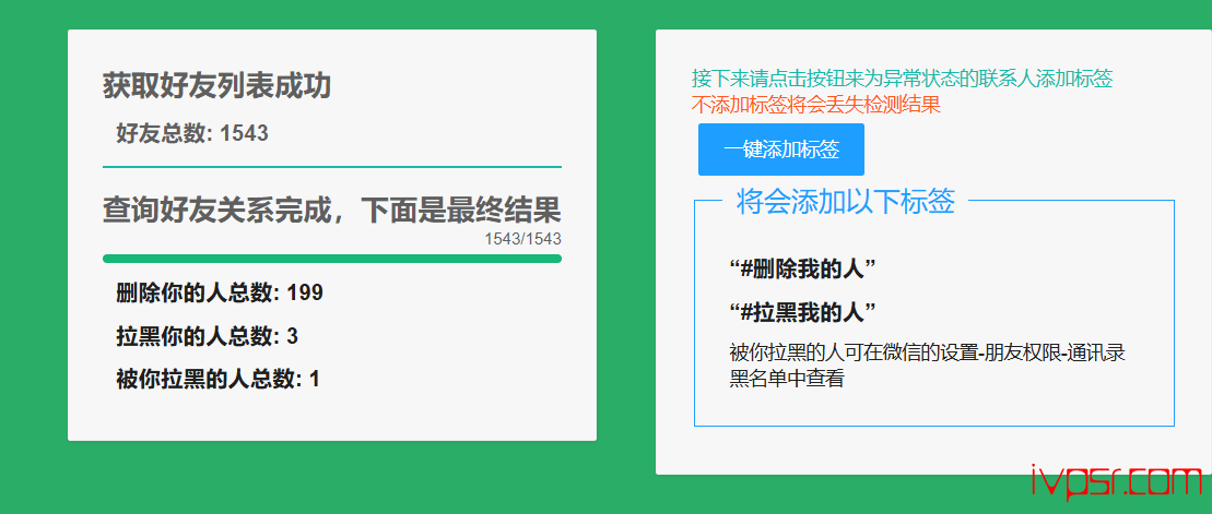 最终扫描完成后,可以看到有多少人删除了你,拉黑了你,你只需要一键添加标签就可以了